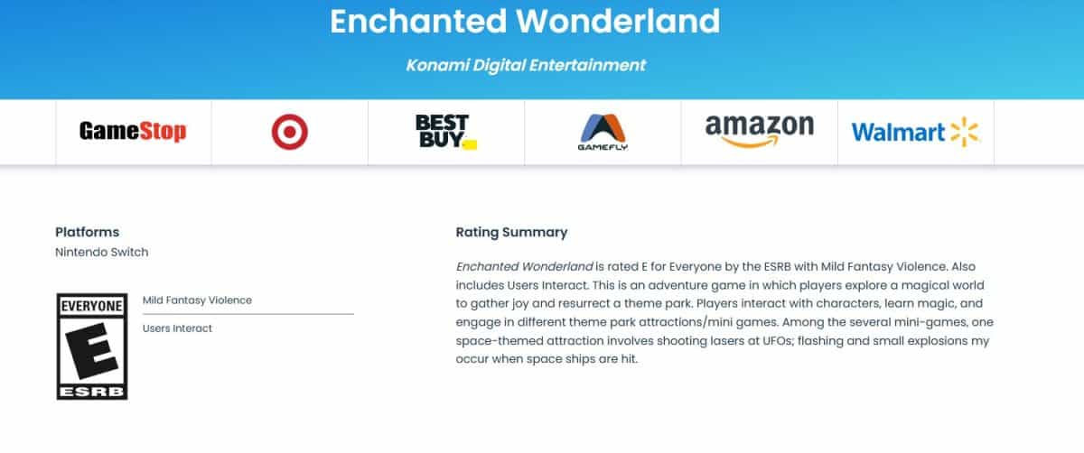ESRB kayıtlarına göre Enchanted Wonderland, E (Everyone) derecesi aldı. İçerik açıklamasında oyunda “Mild Fantasy Violence” bulunduğu belirtilirken, “Users Interact” ifadesi de listede yer alıyor. Bu ibare, oyunda çevrim içi kullanıcı etkileşimi olabileceğine işaret ediyor.